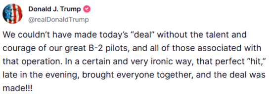 在另一则贴文中,特朗普称,“如果没有我们伟大的B-2飞行员的才华和勇气,以及所有与这次行动有关的人,我们就不可能达成今天(以色列和伊朗之间)的“协议”。颇具讽刺意味的是,正是那次深夜的完美“打击”,把所有人聚集在一起,协议由此达成了!!”