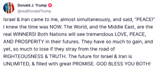 周二亚盘期间,特朗普在其社交媒体平台“真实社交”上再度发文称,以色列和伊朗几乎同时找到我,说要“和平!”我知道现在是时候了。整个世界和中东地区才是真正的赢家!两国未来必将收获无尽的仁爱、和平与繁荣。如果他们偏离了正义和真理的道路,他们会得到很多,但也会失去很多。以色列与伊朗的前途不可限量,充满希望。愿上帝保佑你们两国!