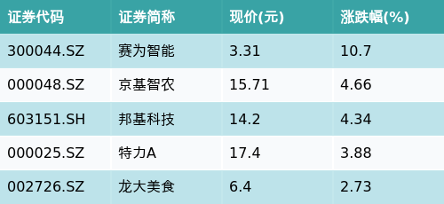 南财智讯5月6日电,天眼查显示,今日猪肉主题震荡,截至收盘(下同)上涨0.21%。持有猪肉主题股票的华夏中证农业主题ETF(516810)上涨0.87%,最新价报0.699元。截至上个交易日(4月30日),该基金近五个交易日净值(复权单位净值,下同)下跌0.6%,近一个月净值上涨1.55%。该基金自(20211229)成立以来净值增长率为-30.56%一片红配资,管理人为华夏基金管理有限公司,基金经理为鲁亚运。截至收盘,猪肉主题涨跌幅最高的五只股票为:赛为智能(300044.SZ)、京基智农(000048.SZ)、邦基科技(603151.SH)、特力A(000025.SZ)与龙大美食(002726.SZ)。详情见下表: