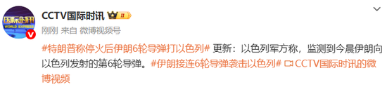 据@CCTV国际时讯 报道,以色列军方称,监测到今晨伊朗向以色列发射的第6轮导弹。